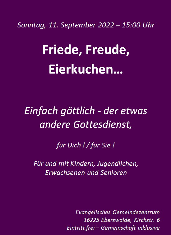 Wir möchten Euch/Sie herzlich zu unserem nächsten Einfach-Göttlich Gottesdienst am kommenden Sonntag den 11.09. in den Luthersaal / Pfarrgarten Kirchstr. 6 einladen.